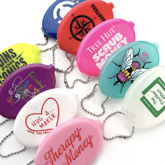 Custom Printed PVC Rubber Squeeze Coin Purse Oval Coin Holder Pouch with Chain