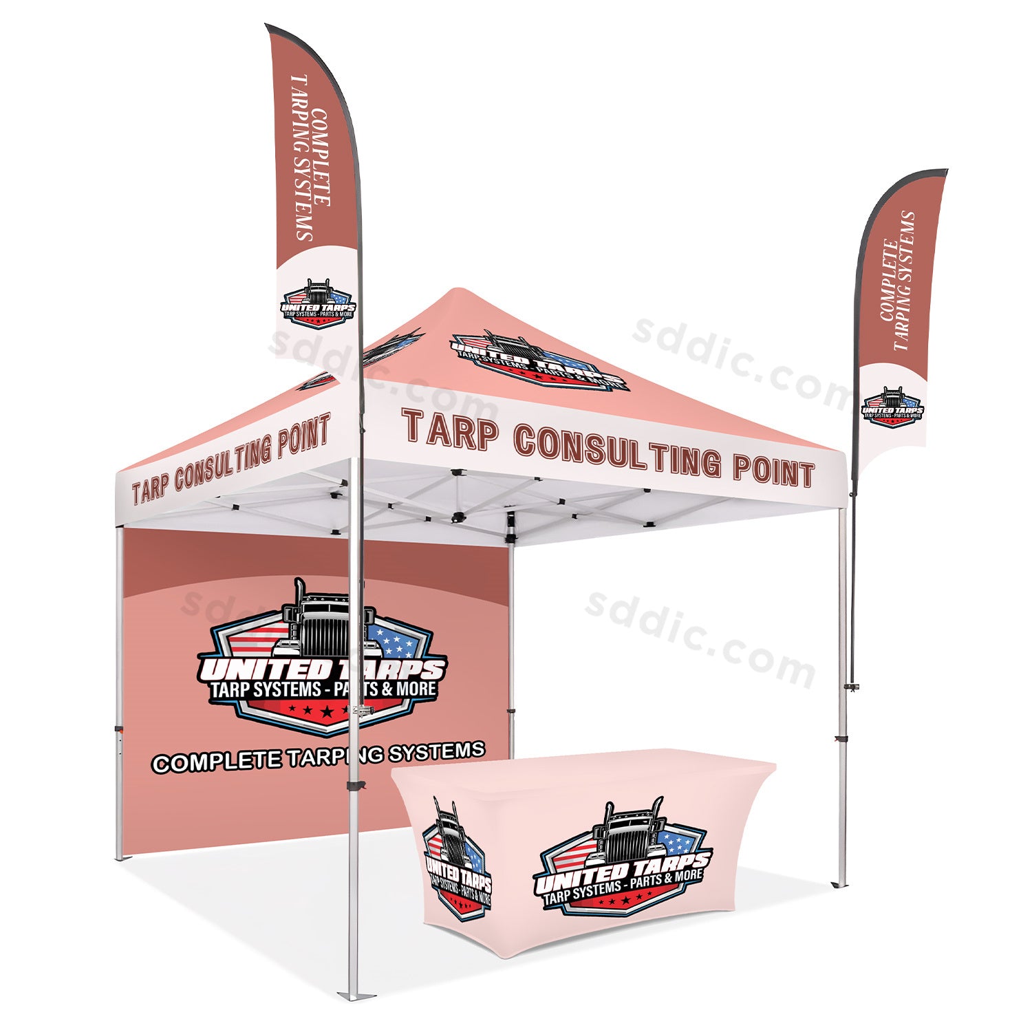 Custom Canopy Tent with Back Wall, Table Cover & Flags Package