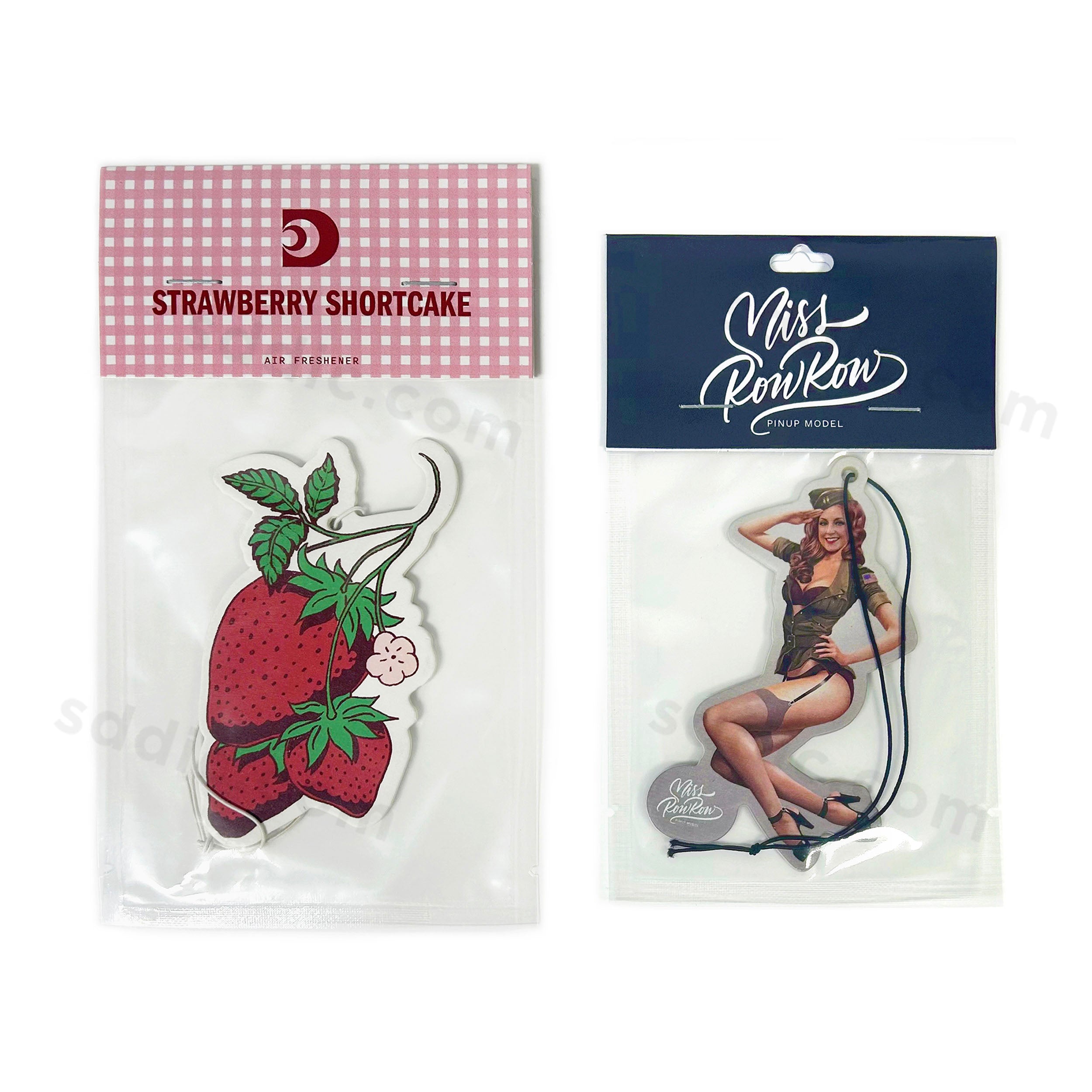 The air freshener is wrapped in a hearder card. The front and back of the hearder card can be customized. An optional built-in hanging hole allows for effortless display. You can print your brand logo, promotional information, website and phone number, etc. on the hearder card to achieve an eye-catching retail presentation. It is an ideal choice for brands seeking professional but cost-effective packaging solutions.