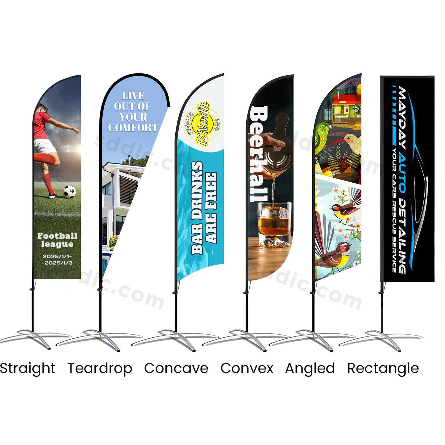Make your brand impossible to miss with our premium collection of Custom Feather Flags! Whether you're promoting a business, hosting an event, or adding flair to your outdoor space, our versatile range of feather flags offers the perfect solution. Choose from a variety of shapes, including teardrop, concave, angled, straight, convex, and rectangle flags, to match your unique needs and branding goals.