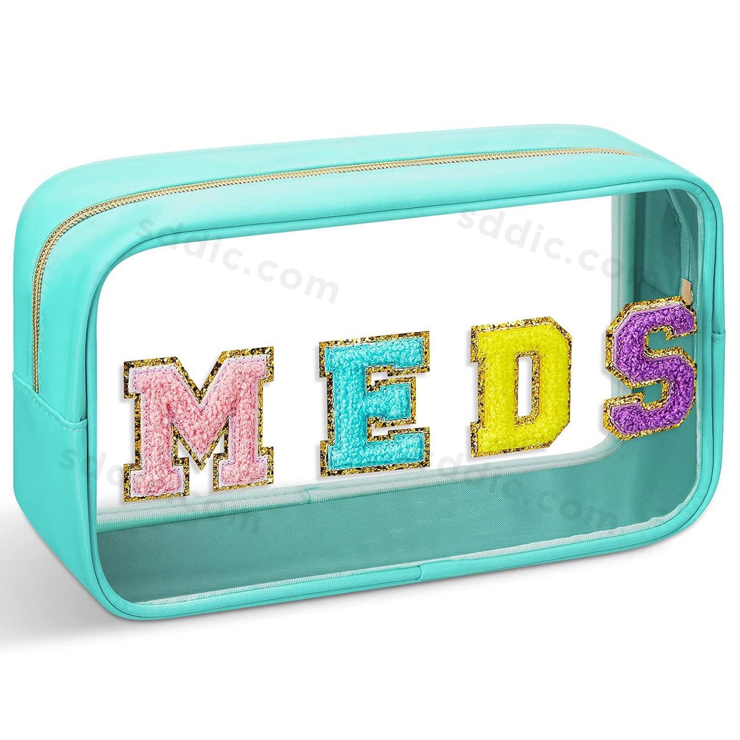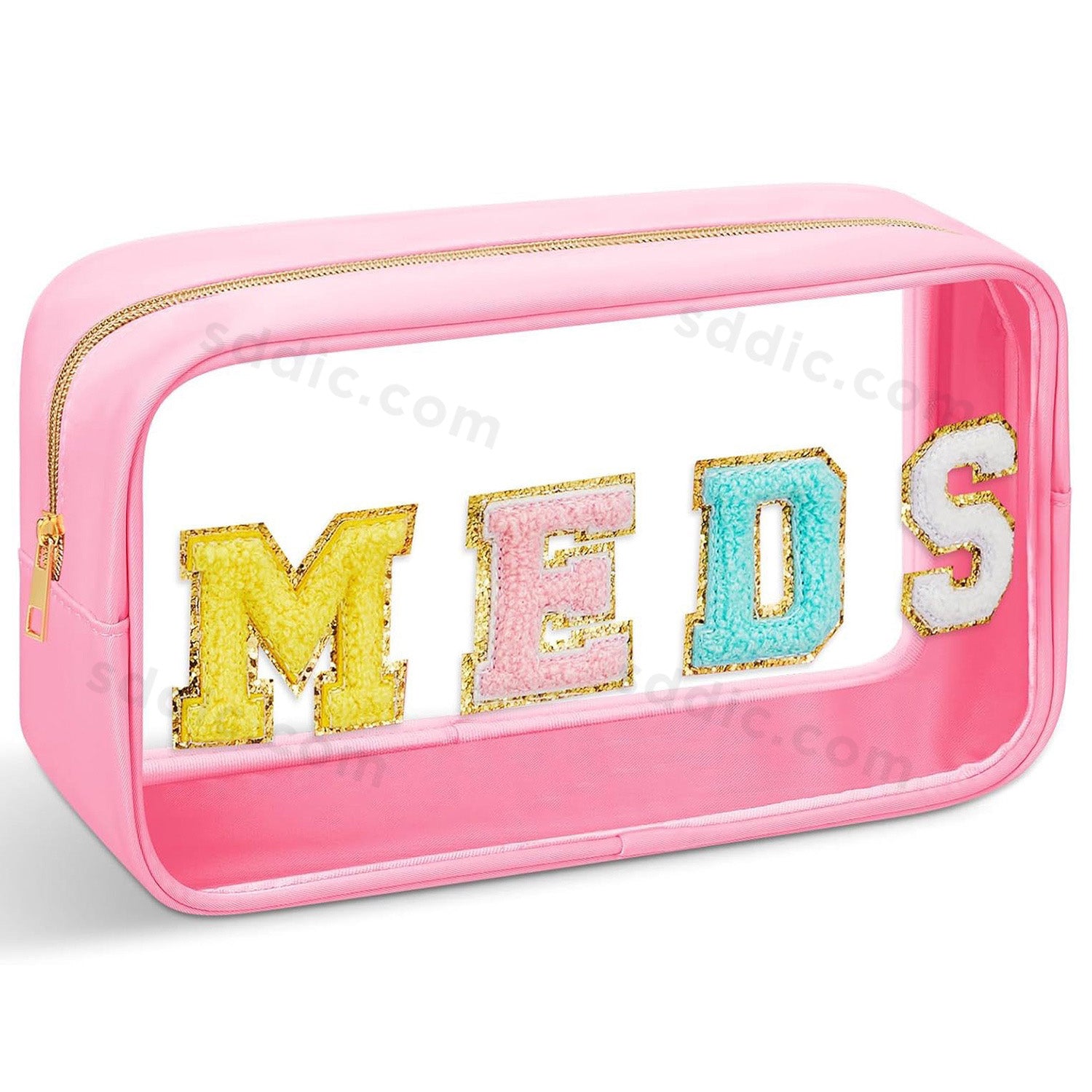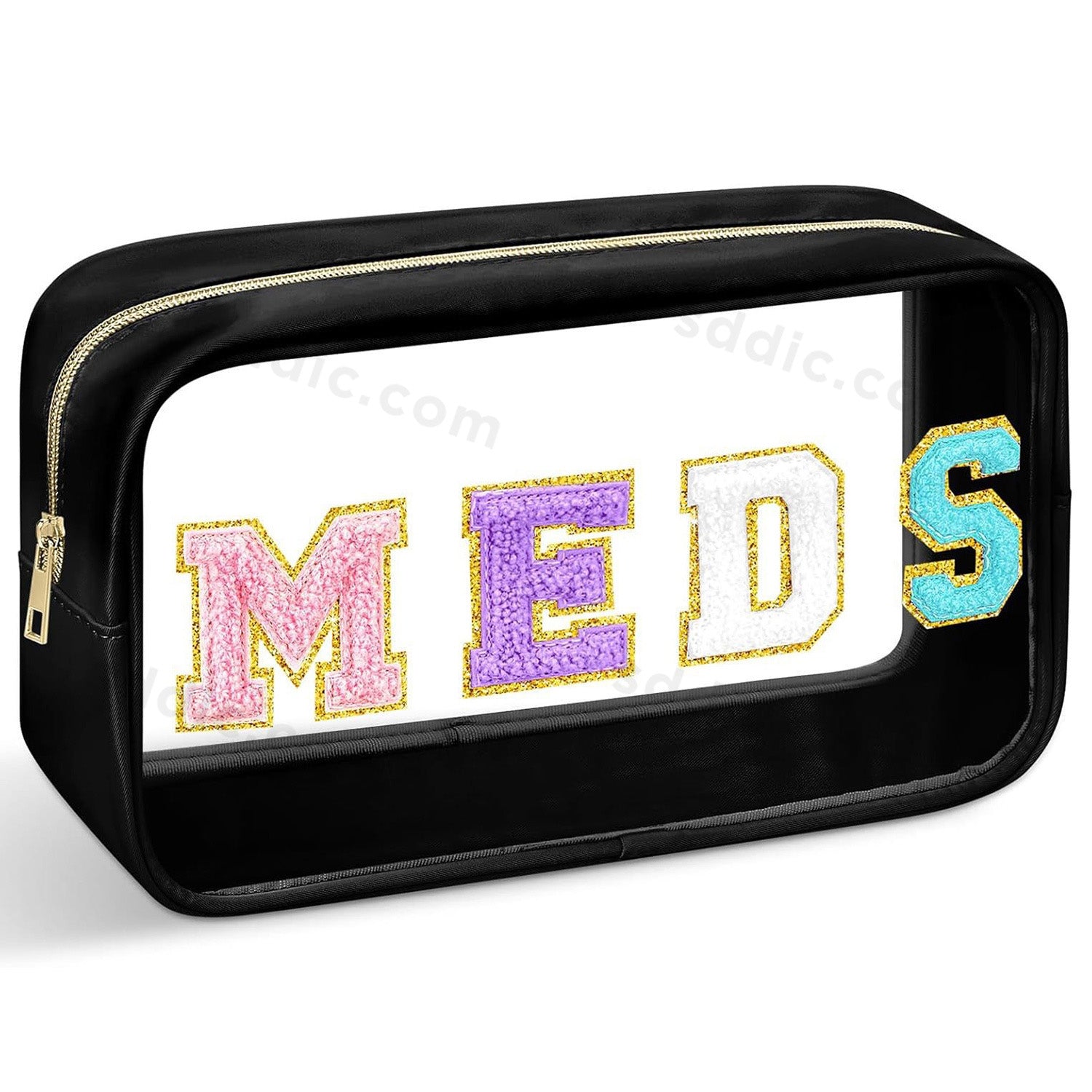 Discover the Glitter Chenille Letter Clear Makeup Bag, a stunning and practical accessory designed to organize your life in style. This toiletry bag features glitter colorful chenille letters MEDS, clear PVC body, offering completely waterproof protection for your cosmetics, travel-sized toiletries, medicines, and on-the-go snacks. Its spacious interior and versatile design make it an essential multi-functional organizer and the perfect ready-to-gift present for friends, family, or yourself.